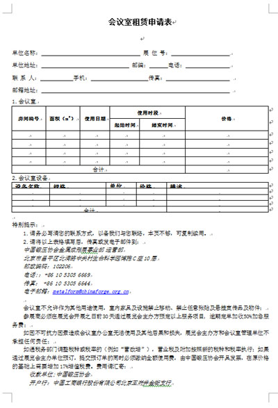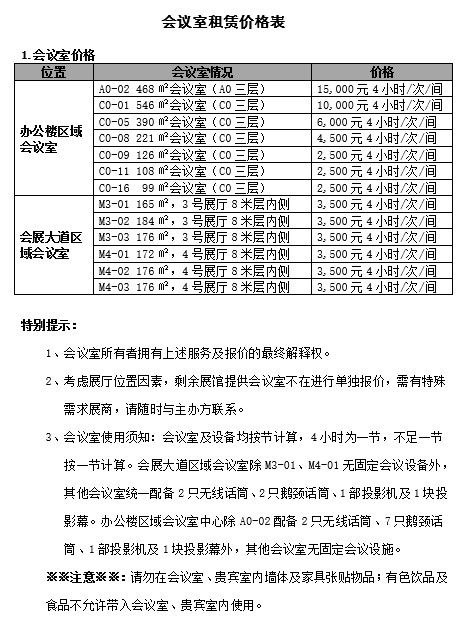 展览会主办单位经过与展览馆管理部门协商,可以代替为展商预订会议室。展商也可以自行找展览馆预订会议室。通过展览会主办方预订,请将《↓ 会议室租赁申请表文件预览