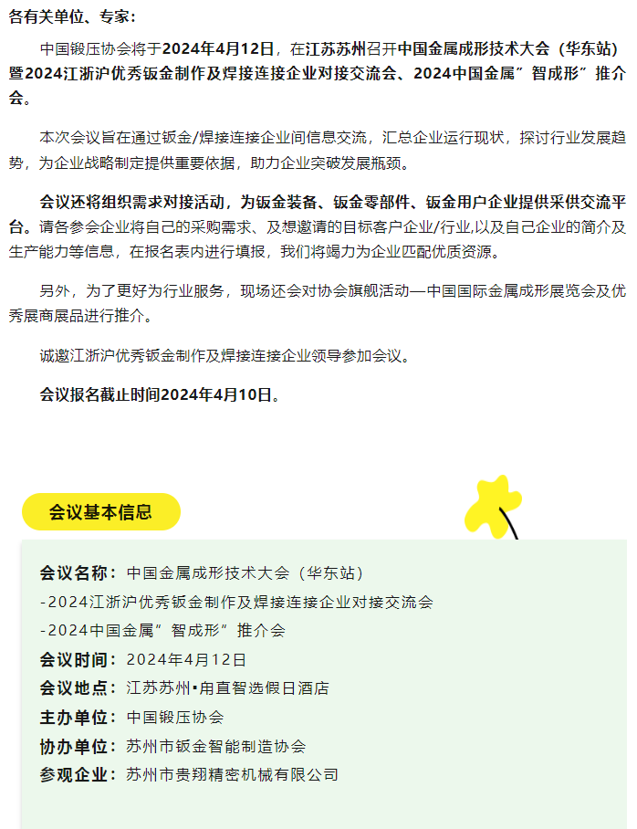 关于召开中国金属成形技术大会(华东站)暨2024江浙沪优秀钣金制作及焊接连接企业对接交流会的通知