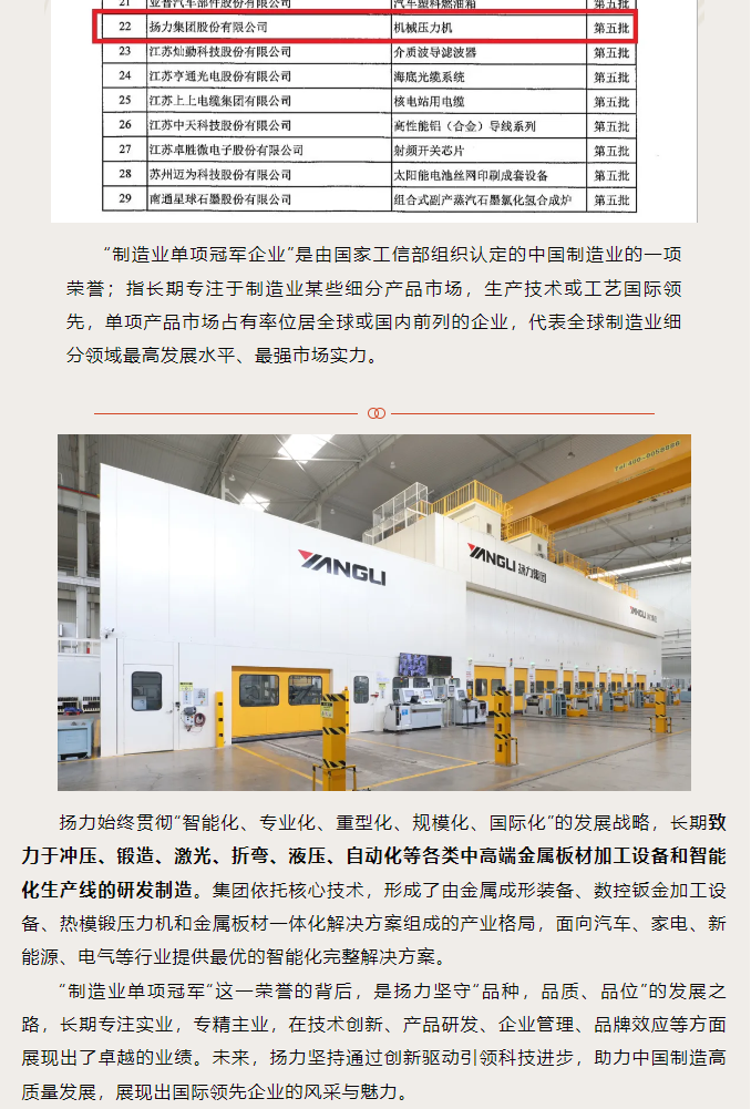 展商资讯丨喜讯-扬力集团成功通过“国家级制造业单项冠军企业”复核!