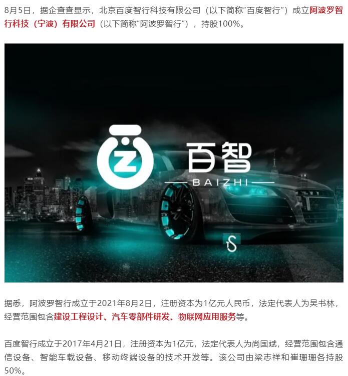 百度智行1亿元成立零部件研发公司