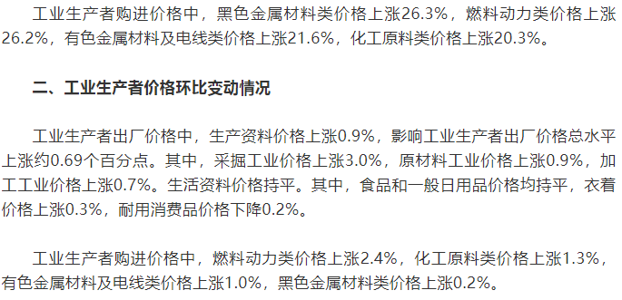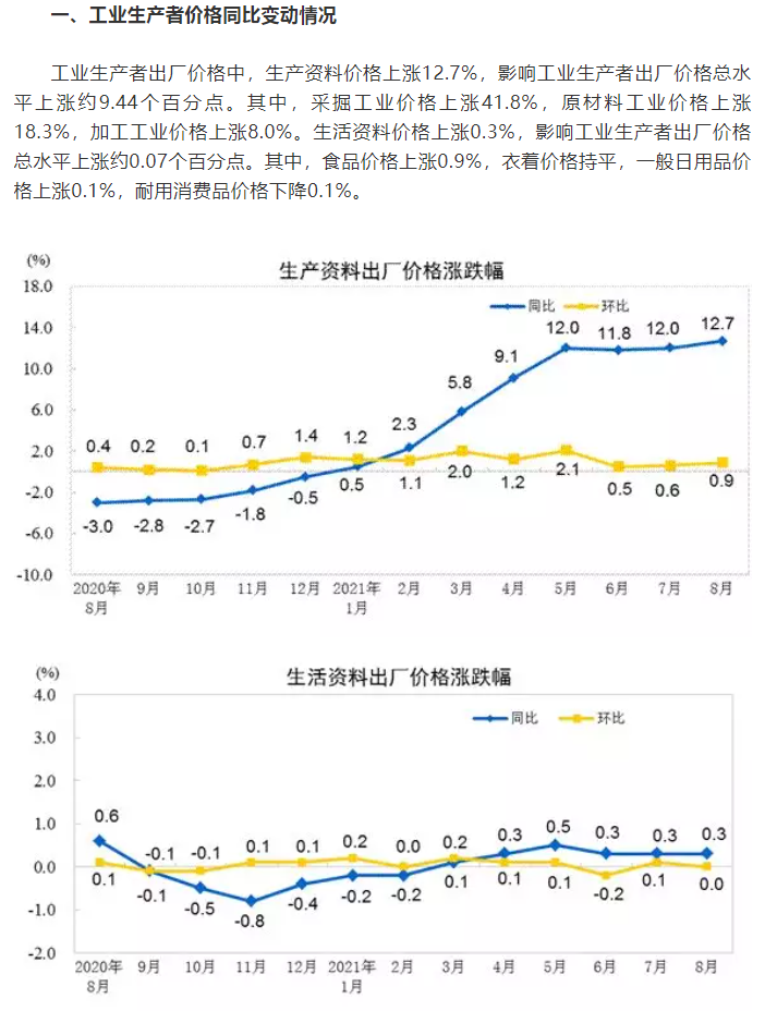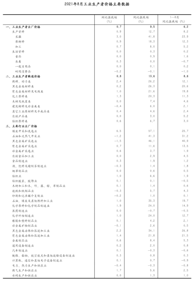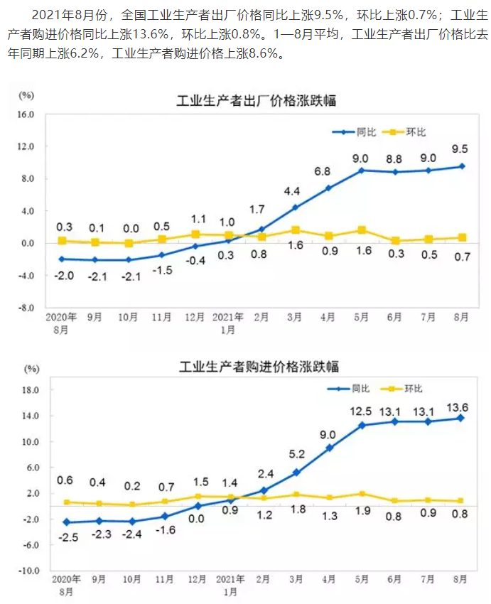【数据发布】2021年8月份工业生产者出厂价格同比上涨9.5% 环比上涨0.7%