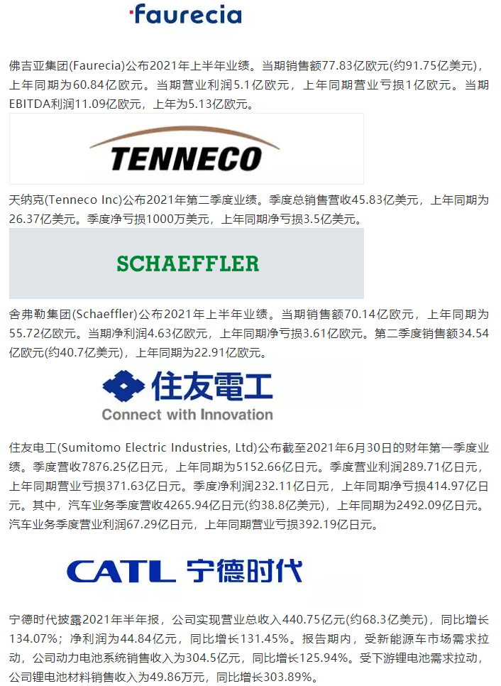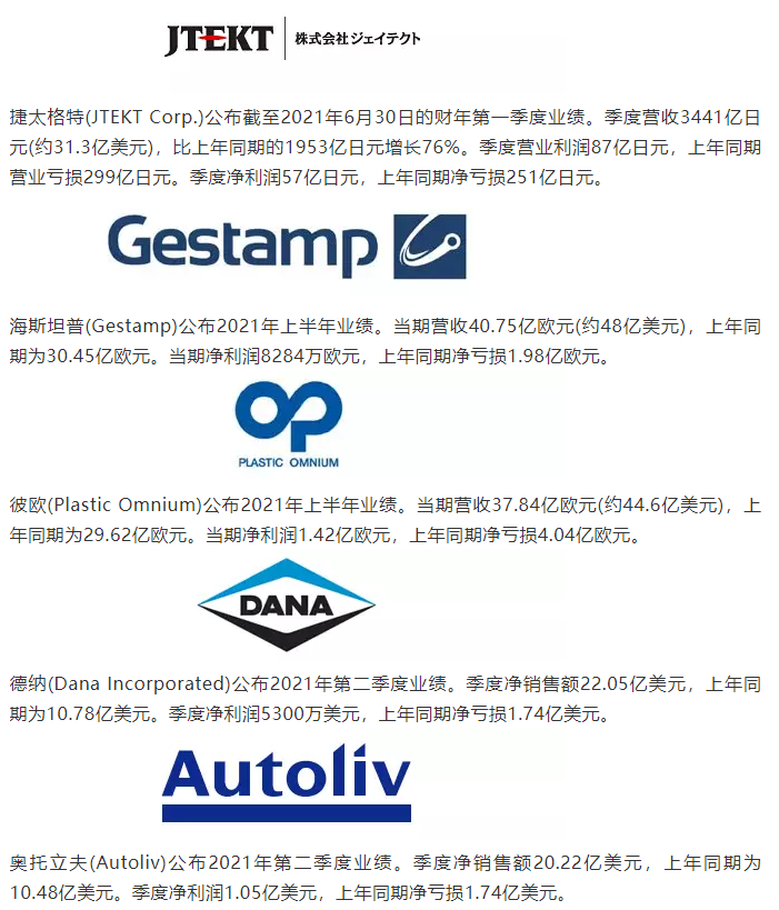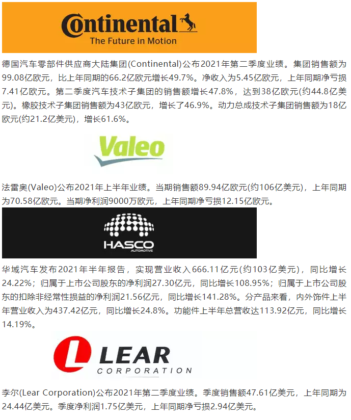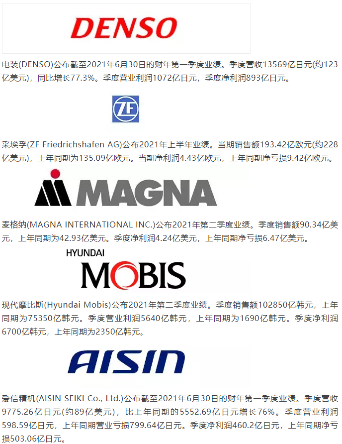 电装、采埃孚、麦格纳、摩比斯、爱信、大陆等25家汽车零部件企业2021第二季度业绩