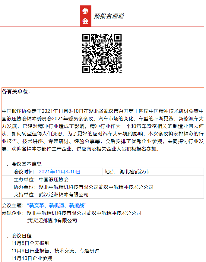 第十四届中国精冲技术研讨会将在湖北武汉举办