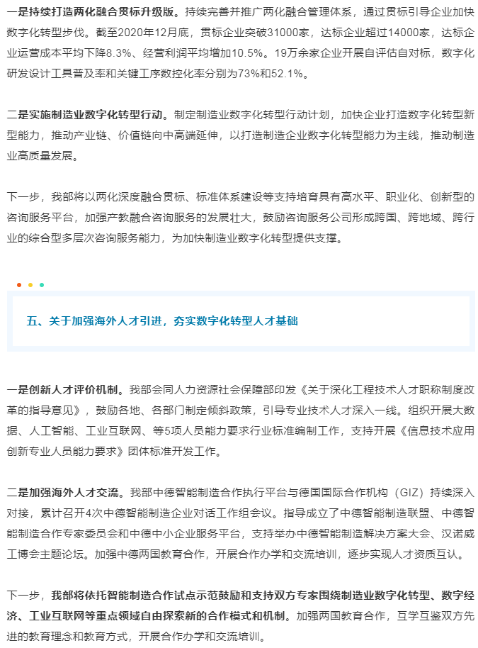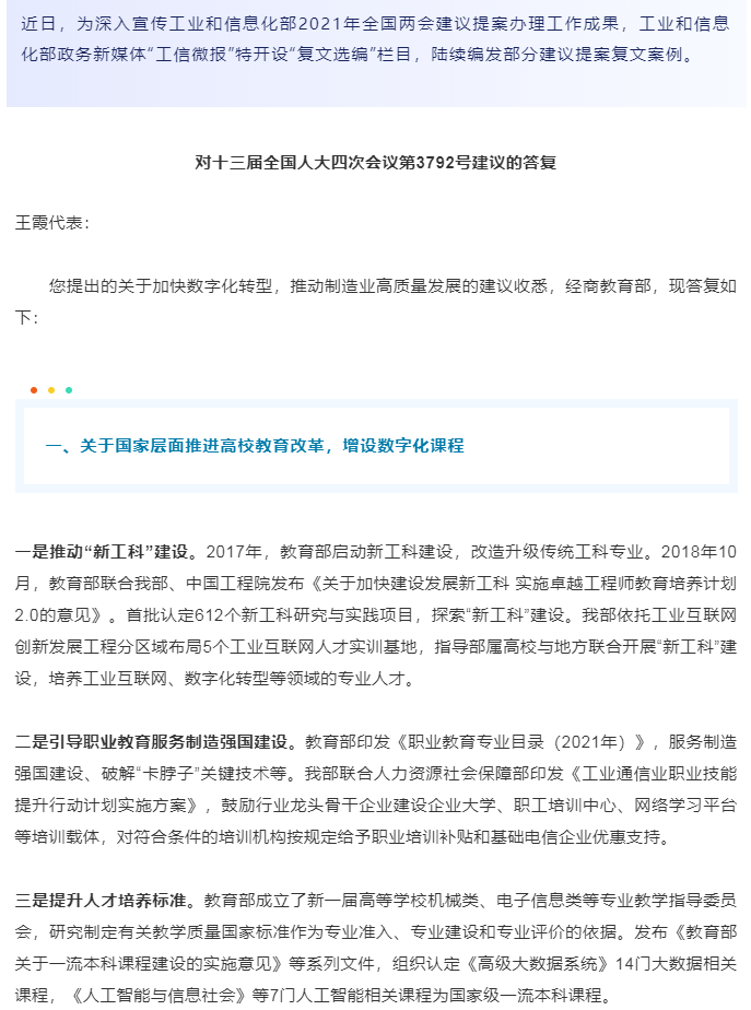 工信部就“关于加快数字化转型,推动制造业高质量发展的建议”进行答复
