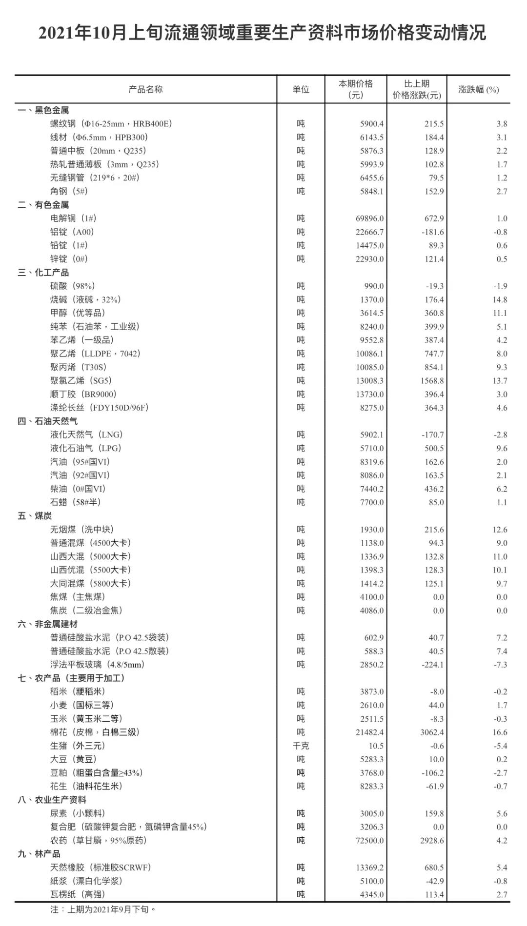 2021年10月上旬流通领域重要生产资料市场价格变动情况