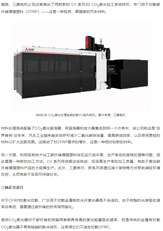 三菱电机推出新激光加工系统 专用于切割碳纤维增强塑料