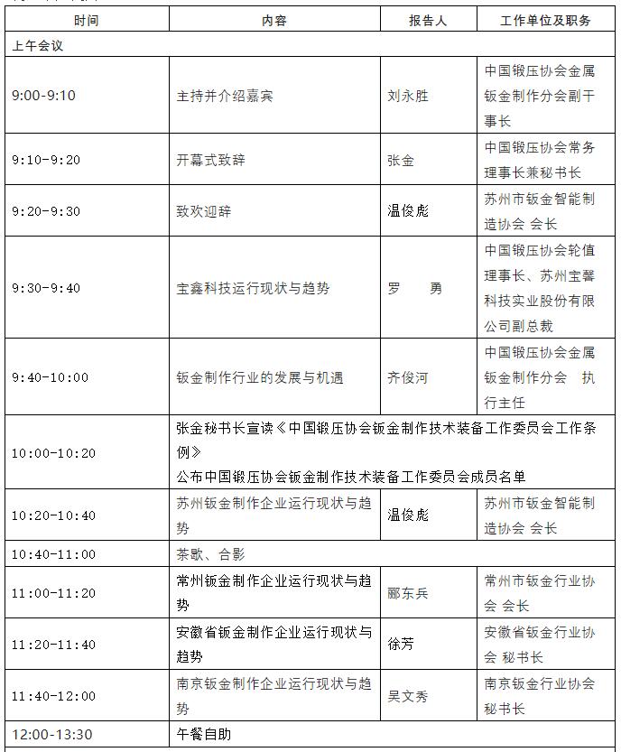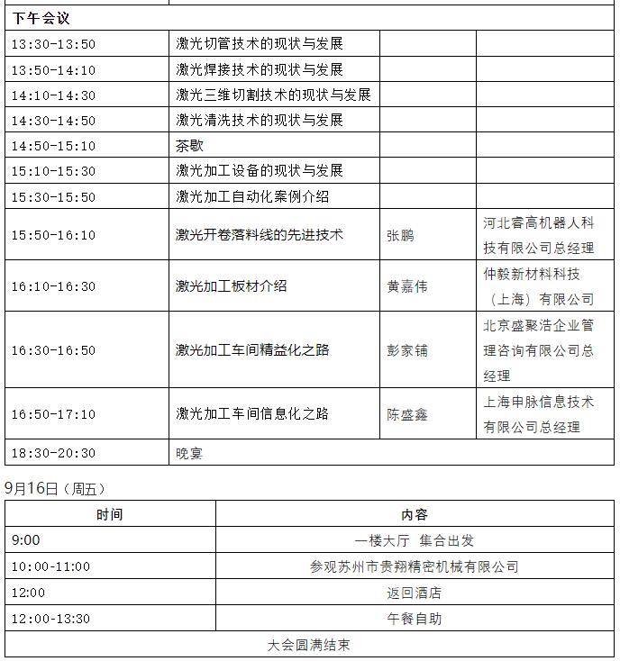会议详情▶ 一、基本信息: 1、会议名称:2022年中国激光加工技术大会暨新利18全网站手机下载 钣金制作技术装备工作委员会成立大会 2、会议主题:高效、绿色 3、会议时间:2022年9月14日(周三)-9月16日(周五) 4、会议地点:苏州 具体酒店待定 5、主办单位:新利18全网站手机下载 6、协办单位:苏州市钣金智能制造协会 二、会议日程: 会议日程(拟定)9月14日(周三)下午