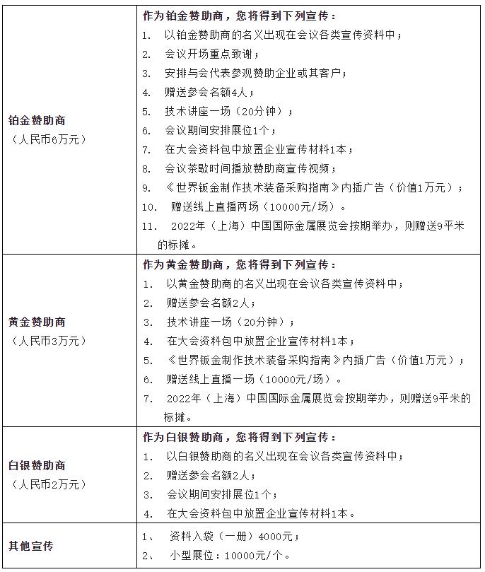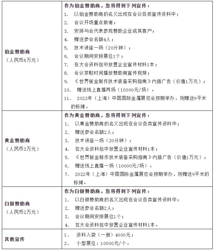 三、会议费: 会议费包含会议注册费、餐费及企业参观费用,差旅费自理。1、钣金零部件企业。每家免除两人参会费(多于两人,按每人600元收费);2、设备、模具、材料、软件等供应商企业。非会员企业2000元/人,会员企业1500元/人。 四、赞助 ![]()