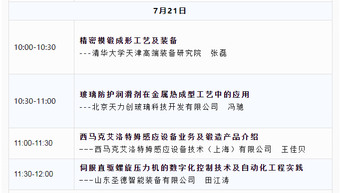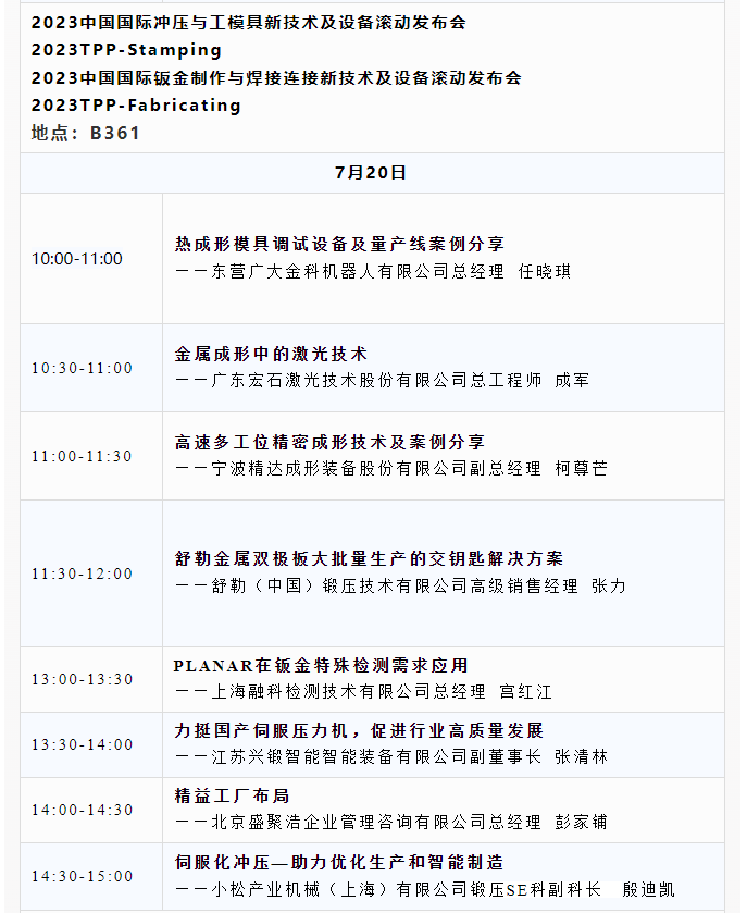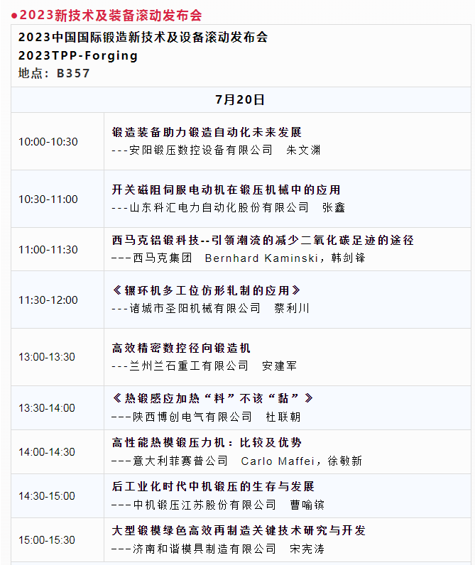 江苏芯创电液伺服技术有限公司 B009 江苏省徐州锻压机床厂集团有限公司 B010 广东河谷流体科技有限公司 B031 宁波拓诚机械有限公司 B032 上海酷润机电科技有限公司 B051 苏州运恒精冲科技有限公司 B052 山东众海机械有限公司 B061 无锡斯丹迪机械有限公司 B062 宁波精达成形装备股份有限公司 B118 舒勒(中国)锻压技术有限公司 B123 济南奥图自动化股份有限公司 B129 苏州网宏自动化设备有限公司 B130 星光树脂制品(昆山)有限公司 B131 广东铭诚科技有限公司 B132 扬州锻压机床有限公司 B133 镐成永生有限公司 B155 江苏拓博制冷科技有限公司 B160 小松产业机械(上海)有限公司 B162 上海宇意机械有限公司 B172 山科伺服(济南)科技有限公司 B185 苏州市玛尔特机电设备有限公司 B193 上海利马达机械有限公司 B202 山东磐金锻造机械有限公司 B209 江苏苏德涂层有限公司 B265 南方泵业股份有限公司 B266 扬力集团股份有限公司 B268 美凯优化学(苏州)有限公司 B272 济南美科自动化设备有限公司 B273 昆山控达克精密机械有限公司 B275 临沂德英格精密锻造有限公司 B276 威海特润博机电科技有限公司 B277 嘉兴柏慕机电有限公司 B278 弗拉迪(宁波)机器人有限公司 B279 嘉兴和新精冲科技有限公司 B281 苏州三维精密金属制品有限公司 B282 仲毅新材料科技(上海)有限公司 B285 武汉华夏精冲技术有限公司 B286 湖北中航精机科技有限公司 B287 伟攀(上海)机械设备有限公司 B289 北京盛聚浩企业管理咨询有限公司 B290 无锡市前洲西塘锻压有限公司 B291 瑞铁机床(苏州)股份有限公司 B292 万创(苏州)智能装备有限公司 B293 河南神州精工制造股份有限公司 B300 同共(湖北)精密成形有限公司 B301 无锡鹏德汽车配件有限公司 B302 中机精冲科技(福建)有限公司 B303 武汉泛洲精冲有限公司 B305 江苏胜莱新能源科技有限公司 B312 苏州施米特机械有限公司 B322 江苏拢研机械有限公司 B330 奥特林豪斯传动技术(上海)有限公司 B331 鞍山嘉阳重工科技有限公司 B350 杭州钢易科技有限公司 B351 东营广大金科机器人有限公司 B352 江苏太平洋精锻科技股份有限公司 B360 河北拓思机械设备有限公司 C005 中机锻压江苏股份有限公司 C009 淄博宏杰自动化设备有限公司 C020 故城县风动摩擦密封材料有限公司 C027 泰安市华伟重工责任有限公司 C028 西马克集团 C036 隔而固(青岛)振动控制有限公司 C051 威泰克科技(大连)有限公司 C055 诸城市圣阳机械有限公司 C059 哈特贝尔金属成型技术(上海)有限公司 C060 帕珂表面处理技术(上海)有限公司 C062 贵阳天龙摩擦材料有限公司 C063 JNH PRESS CO.,LTD C066 江兴(太仓)金属制品有限公司 C067 北美防锈技术(上海)有限公司 C079 无锡优航动力科技有限公司 C080 苏州金凯达机械科技股份有限公司 C081 安阳锻压(集团)机械工业有限公司 C096 宁波华大液压有限公司 C100 浙江赛克斯精锻科技有限公司 C102 无锡沃信流体设备科技有限公司 C103 中冶重工(唐山)有限公司 C105 山东荣泰感应科技有限公司 C106 安徽东耘智能设备制造有限公司 C108 济南和谐模具制造有限公司 C109 山西晨辉锻压设备制造股份有限公司 C111 博德精细化工(上海)有限公司 C116 南京江联焊接技术有限公司 C118 威普克潘克科技(北京)有限公司 C121 株式会社 万陽 C123 山东铭仁重型机械股份有限公司 C126 台州雍昌润滑材料科技有限公司 C128 沈阳名华时代科技有限公司 C129 浙江威力士机械有限公司 C131 青岛高而富石墨有限公司 C153 宜兴市磁通探伤材料有限公司 C155 青岛南墅石墨有限公司 C156 山东正祥工矿设备股份有限公司 C158 江苏宏程数控机床有限公司 C159 重庆江东机械有限责任公司 C161 山东万利精密机械制造有限公司 C168 嘉善坤利精密金属模具有限公司 C169 芜湖三联锻造股份有限公司 C171 江苏兴锻智能装备科技有限公司 C194 泊头市金键模具有限责任公司 C198 泰易达(江苏)伺服冲床有限公司 C199 浙江阿波罗工具有限公司 C200 许昌中发耐磨材料研究所有限公司 C201 青岛昊阳机械有限公司 C203 成都壹佰科技有限公司 C210 山东千里马锻压自动化设备有限公司 C212 上海三造机电有限公司 C220 湖州鑫科锻压机床有限公司 C221 北京富京技术公司 C222 山东凯泰焊接技术有限公司 C226 湖北神海机械科技有限公司 C231 江苏百协精锻机床有限公司 C232 无锡沃尔得精密工业有限公司 C368 瑞安市龙力机械制造有限公司 C501 淄博桑德机械设备有限公司 C510 无锡市大桥轴承机械有限公司 C535 杭州科远电炉有限公司 C535 无锡市盛宝嘉科技有限公司 C535 浙江欧锻重工机械有限公司 C535 郑州华隆机械制造有限公司 C550 辛北尔康普(青岛)机器设备有限公司 C551 天津市天锻压力机有限公司 E001 广东锻压机床厂有限公司 E008 上海万镭激光科技有限公司 E026 山东科汇电力自动化股份有限公司 E035 济南舒兹米勒自动化设备有限公司 E038 浙江晨龙锯床股份有限公司 E099 浙江易田精工机械股份有限公司 E102 三共机械销售(上海)有限公司 E106 山东莱恩光电科技股份有限公司 E116 青岛方泽机械科技有限公司 E119 杭州国隆加热设备有限公司 E121 济南昊中自动化有限公司 E126 上海融科检测技术有限公司 E152 湖州机床厂 E156 南京泽荣自动化系统有限责任公司 E157 江苏金沃伺服冲床有限公司 E158 金丰(中国)机械工业有限公司 E207 佛山登奇机电技术有限公司 E209 浙江易锻