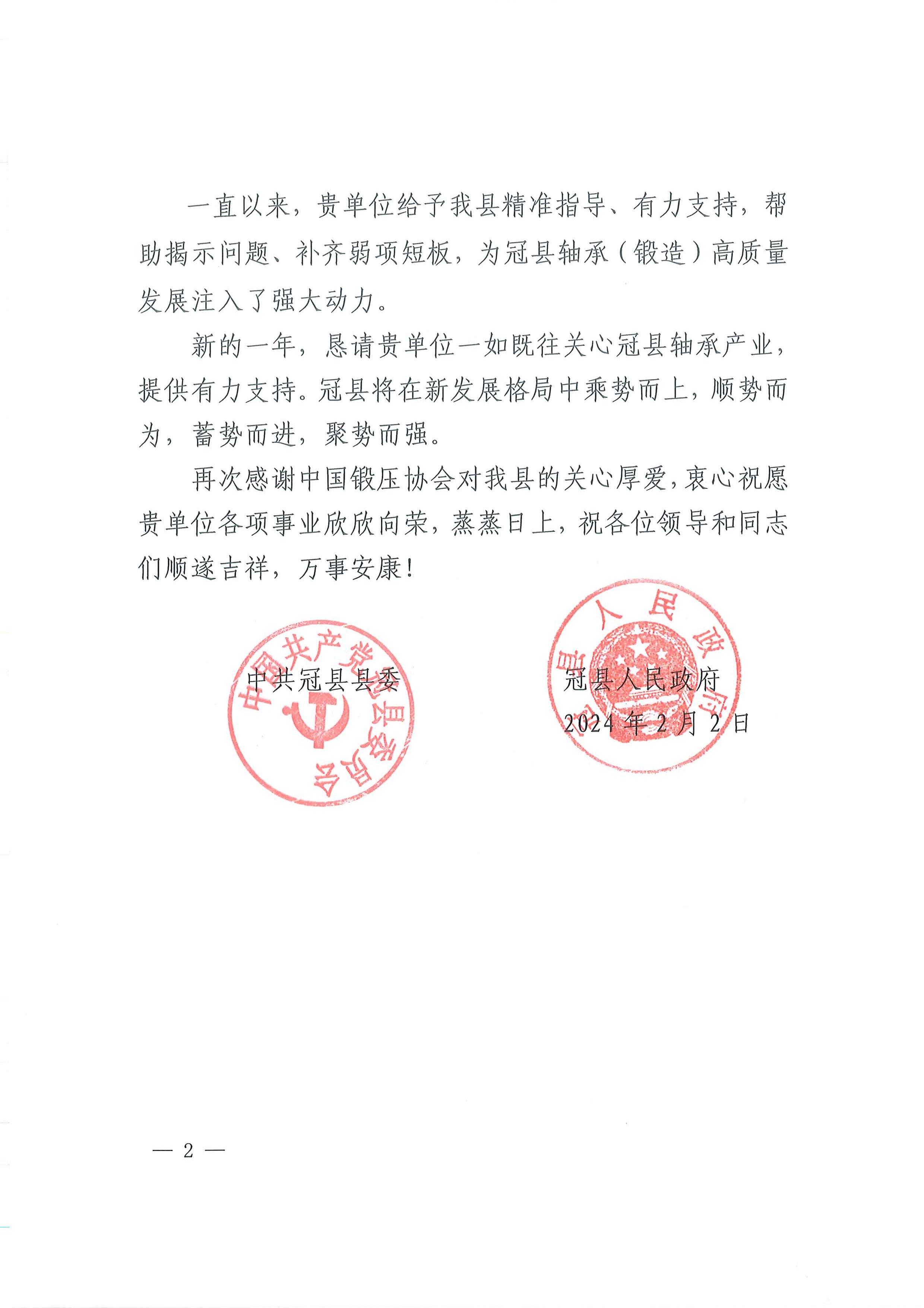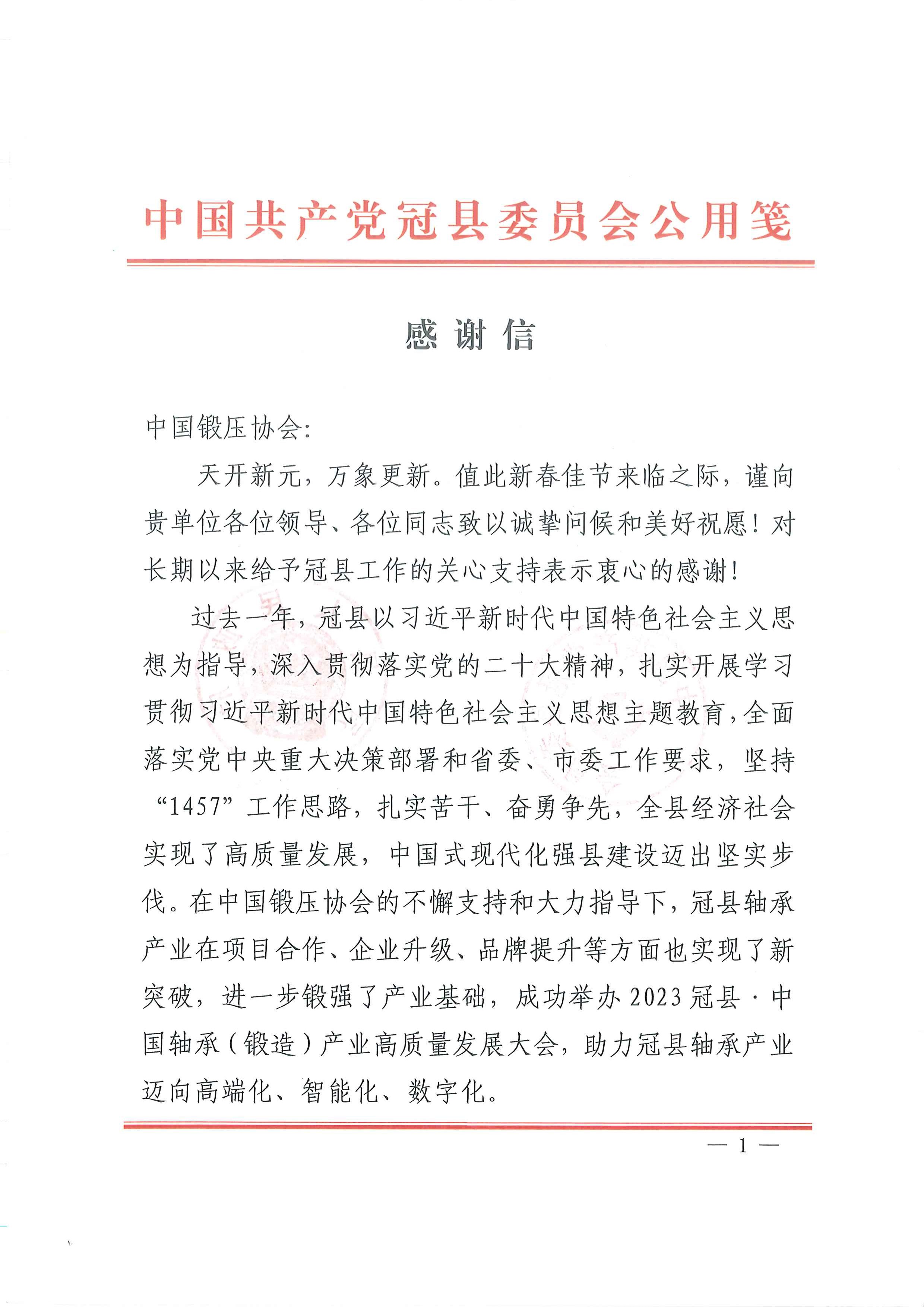 喜报!中共冠县向新利18全网站手机下载 发来感谢信!
