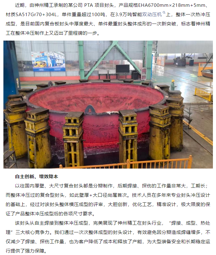 神州封头再创佳绩!EHA6700mm×218mm+5mm复合封头整体冲压成型