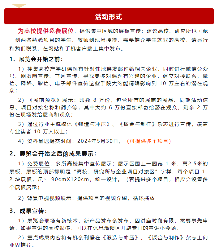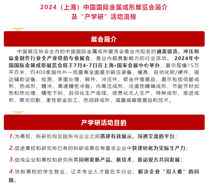 各有关院校和科研机构: 产学研一体化发展是多年来国家一直提倡的体制。随着技术发展和创新形态的演变,各企业需要更多先进的技术支持。产业、学校、科研机构等应当相互配合,发挥各自技术资源和产业资源优势,形成强大的研究、开发、生产一体化的先进系统并在运行过程中体现出综合优势成为了产业发展的主流。 为了更好地将院校与科研机构的成果投入到企业实际生产上,中国国际金属成形展览会主办方-新利18全网站手机下载 一直在展会前、中和后开展有关高校、研究院所与企业之间的项目对接、人才推介的配套活动,为各高校、研究院所和企业建立一个专属平台,将企业亟待解决的技术问题与院校与科研机构的先进成果更好地进行接轨,做到产、学、研三者相结合,共同促进行业的交流,产业的进步。从2020年起,中国国际金属成形展览会将专门设置“科研成果”展示区,免费为大专院校和科研机构(非企业性质或非工商注册类)提供展示,并在相应位置设置洽谈交流区,从而为展商、观众、大专院校和研院所提供技术和人才对接服务。 2024年,新利18全网站手机下载 将在上海继续举办一年一度锻压行业“九月节”,并继续组织2024技术合作与人才交流行动暨2024高校、研究院所与企业之间的技术项目对接与人才推介行动。 在此,诚挚的向各位专家、学者及行业相关人士发出邀请!