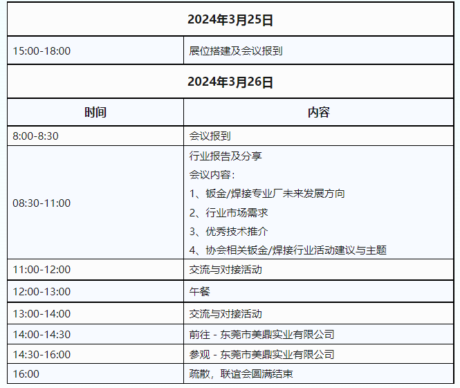 各有关单位、专家: 新利18全网站手机下载 将于2024年3月26日,在广东深圳召开中国金属成形技术大会(大湾区站)暨2024大湾区优秀钣金制作及焊接连接企业对接交流会、2024中国金属“智成形”推介会。 本次会议旨在通过钣金/焊接连接企业间信息交流,汇总企业运行现状,探讨行业发展趋势,为企业战略制定提供重要依据,助力企业突破发展瓶颈。 会议还将组织需求对接活动,为钣金装备、钣金零部件、钣金用户企业提供采供交流平台。请各参会企业将自己的采购需求及想邀请的目标客户企业/行业,以及自己企业的简介及生产能力等信息,在报名表内进行填报,我们将竭力为企业匹配优质资源。 另外,为了更好为行业服务,现场还会对协会旗舰活动—中国国际金属成形展览会及优秀展商展品进行推介。 诚邀大湾区优秀钣金制作及焊接连接企业领导参加会议。 会议报名截止时间2024年3月25日。 会议详情 ■会议名称:中国金属成形技术大会(大湾区站) -2024大湾区优秀钣金制作及焊接连接企业对接交流会 -中国金属“智成形”推介会 ■会议时间:2024年3月26日 ■会议地点:深圳光明虹桥公园希尔顿花园酒店(深圳市光明区科泰路1328号) ■主办单位:新利18全网站手机下载 ■参观企业:东莞市美鼎实业有限公司 ■会议日程
